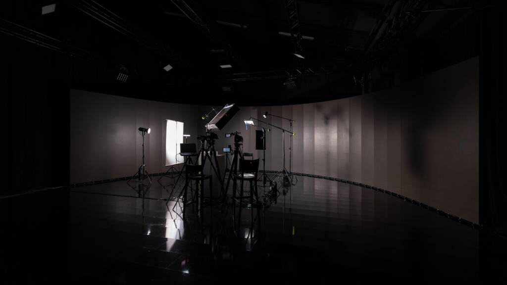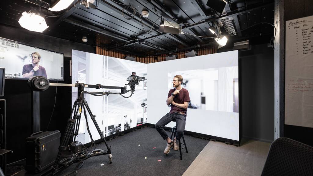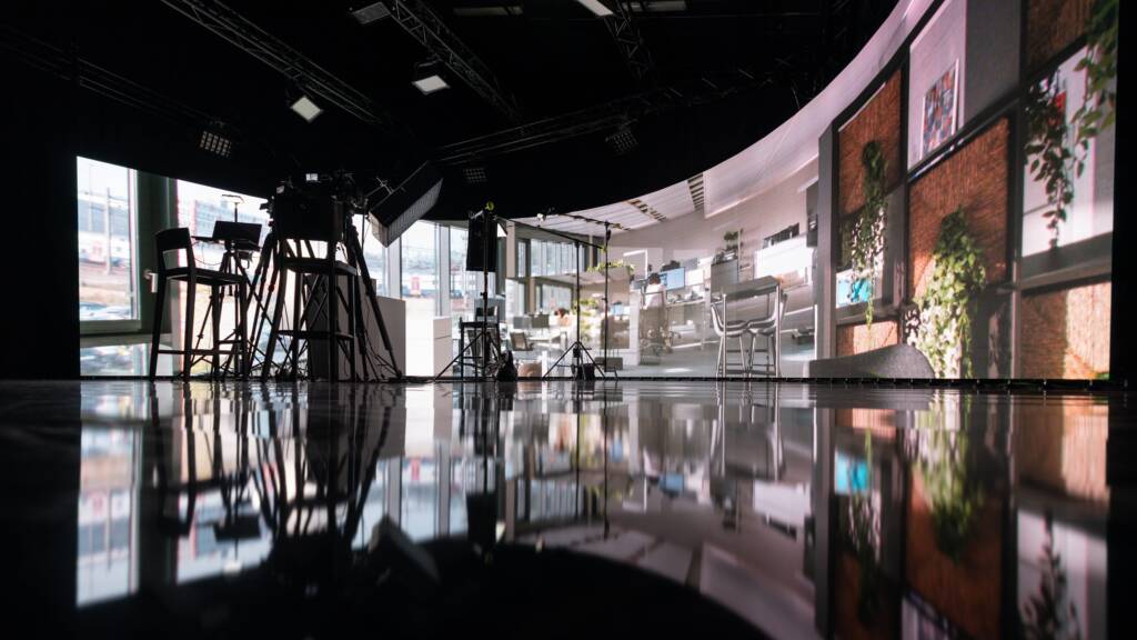 Virtuelle Produktionen sind aus grossen Filmproduktionen wie z.B.: The Mandalorian oder 1899 bekannt. Riesige Studiohallen, in denen mit Hilfe von LED-Wänden eine virtuelle Szenerie mit dem realen Set verschmilzt. Kamerabewegungen werden erfasst und die 3D-Szene auf der LED-Wand entsprechend perspektivisch verschoben, so dass nicht mehr ersichtlich ist, wo das reale Set aufhört und die digital ergänzte Welt beginnt.