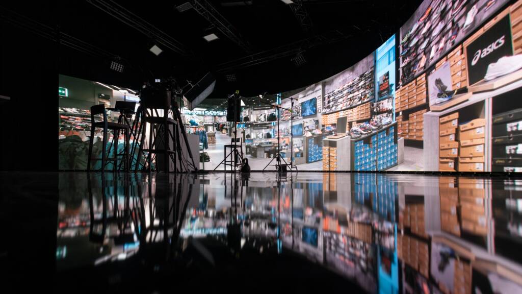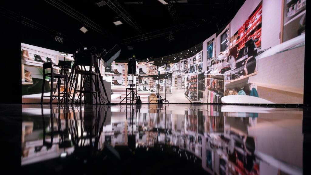 Wir haben die Dosenbach-Filiale nicht dreidimensional nachgebaut, kein aufwendiges Set kreiert, nicht einmal die Kamera bewegt. Unser Ziel war es lediglich, die riesige LED-Wand zu nutzen, um ein Bild der Filiale so zu bespielen, dass es aussieht, als würden die Mitarbeiterinnen und Mitarbeiter im Gespräch in der Filiale sitzen. Klingt einfach, hat aber durchaus seine Kniffe.