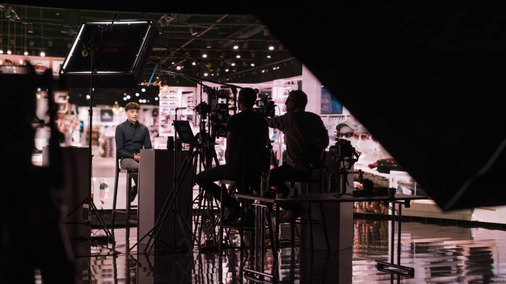 Nach dem Aufbautag folgten vier Drehtage mit insgesamt 33 Protagonistinnen und Protagonisten der verschiedenen Marken. Da wir keine An- und Abreise hatten und unser Interview-Setup nicht jeden Tag neu aufbauen mussten, konnten wir das Timing sehr effizient gestalten und trotzdem die Anforderung erfüllen, die Interviews im Arbeitskontext zu drehen.