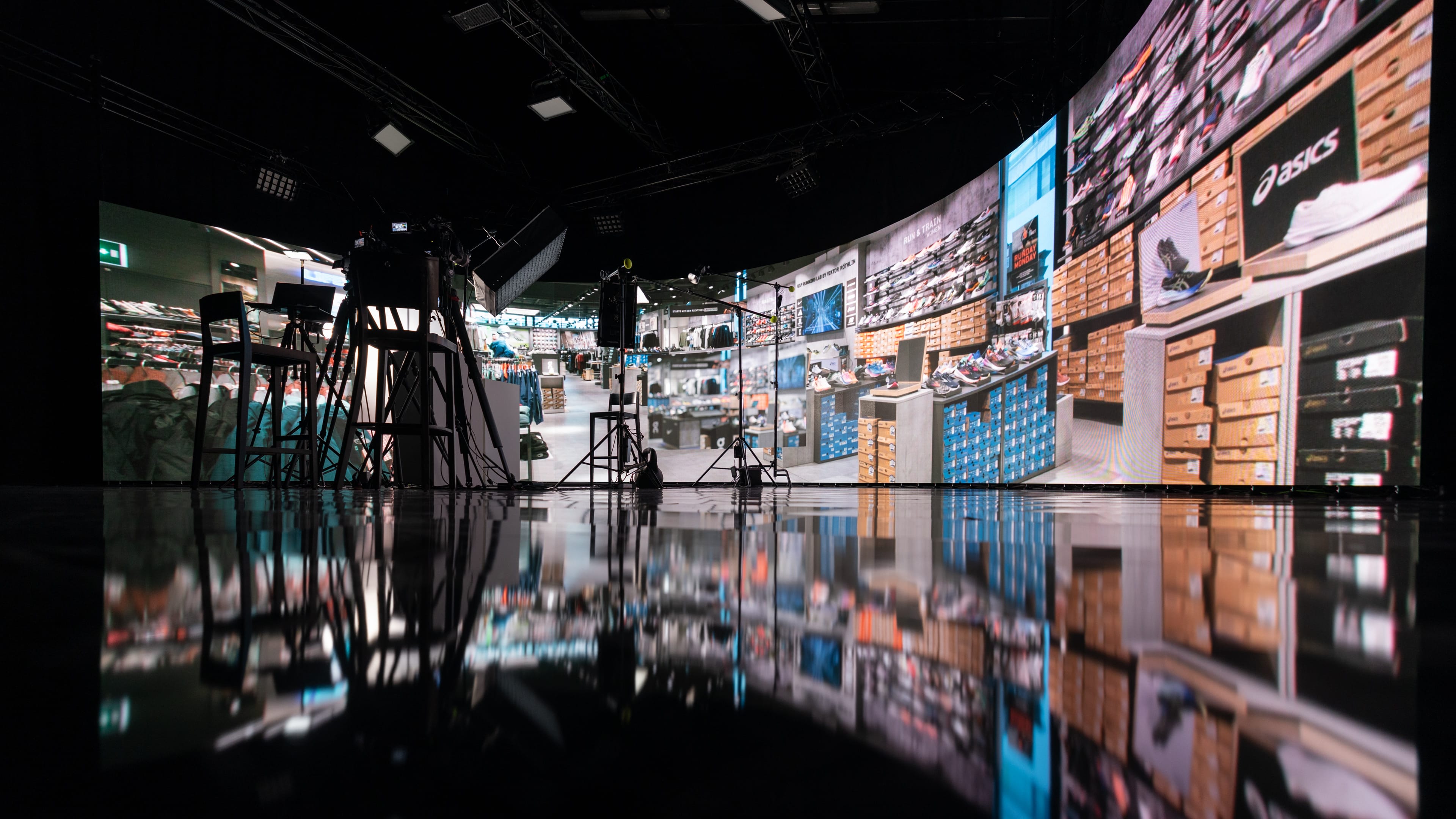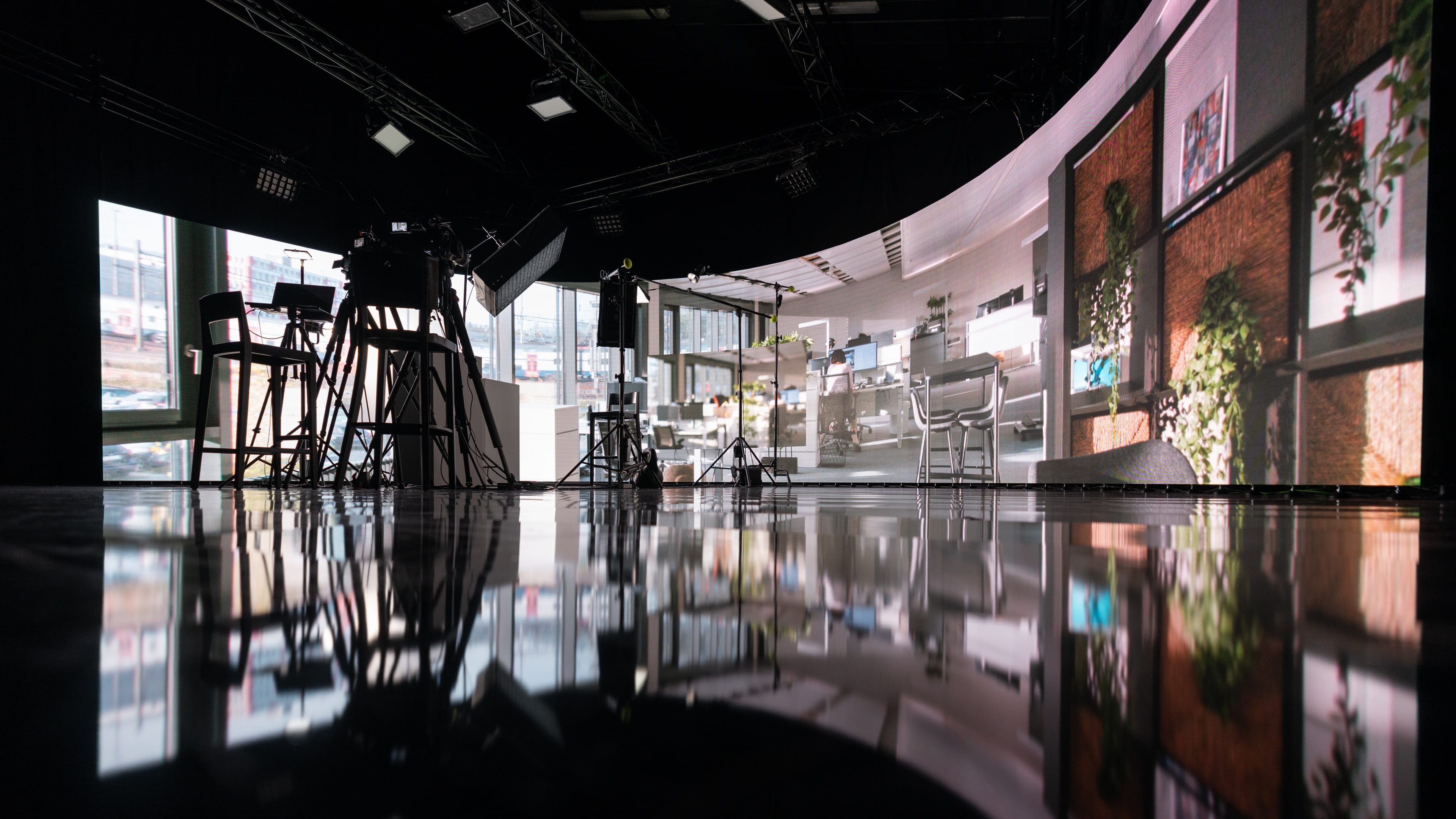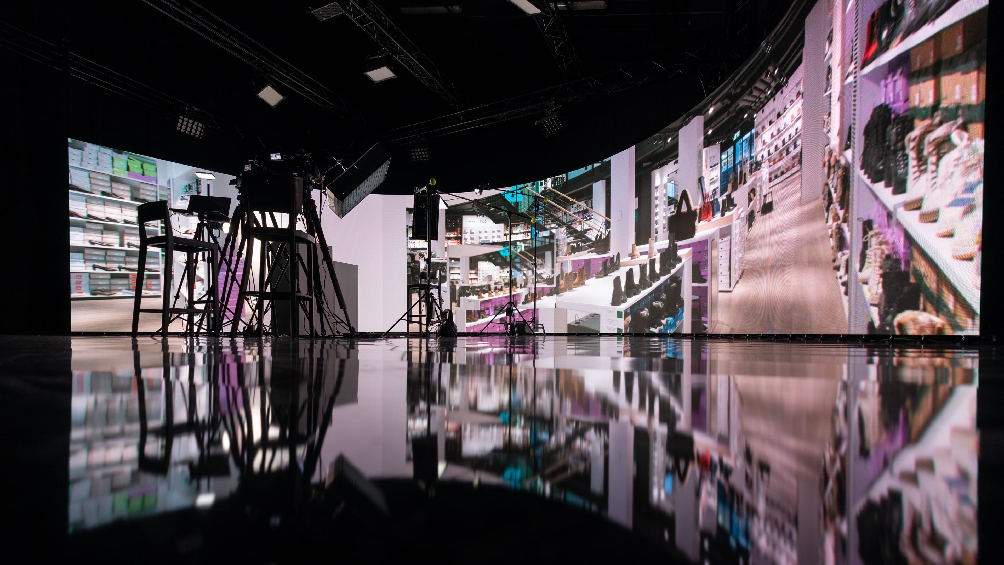 Wir haben die Dosenbach-Filiale nicht dreidimensional nachgebaut, kein aufwendiges Set kreiert, nicht einmal die Kamera bewegt. Unser Ziel war es lediglich, die riesige LED-Wand zu nutzen, um ein Bild der Filiale so zu bespielen, dass es aussieht, als würden die Mitarbeiterinnen und Mitarbeiter im Gespräch in der Filiale sitzen. Klingt einfach, hat aber durchaus seine Kniffe.