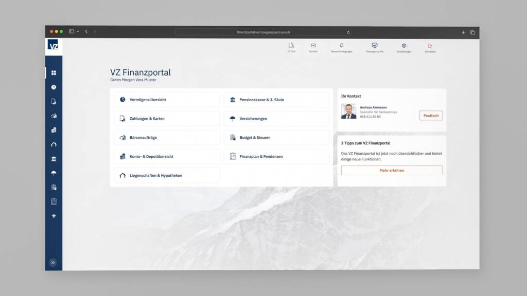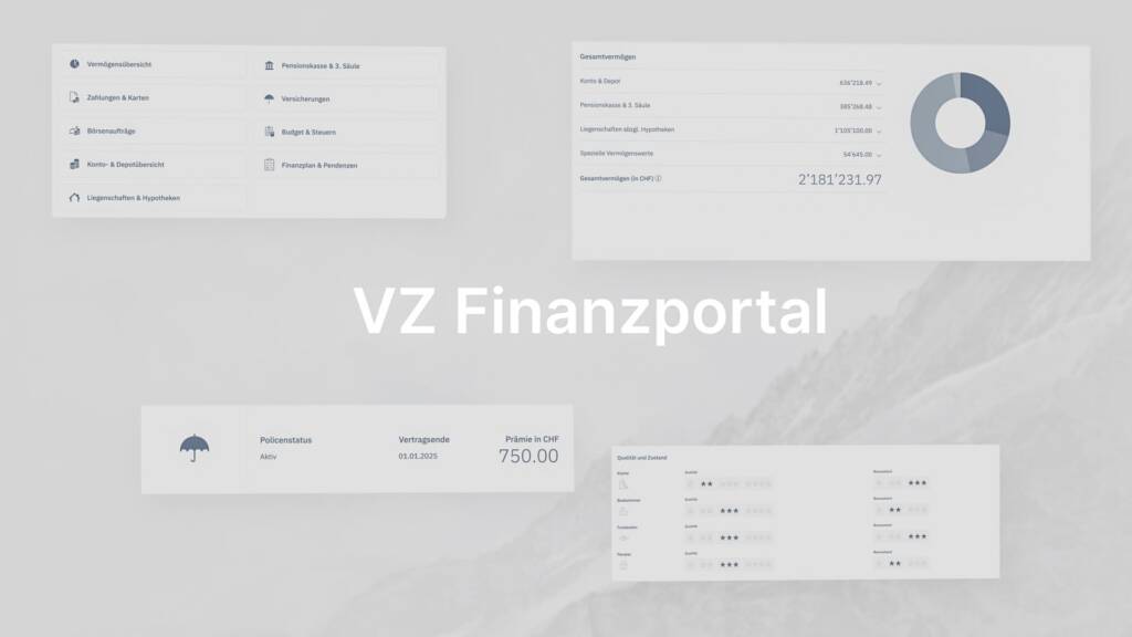 Das VZ Vermögenszentrum hat mit seinem Finanzportal den Anspruch einer holistischen Abbildung des Vermögens ihrer Kund:innen. Die Tools des Finanzportals gehen daher weiter als die E-Bankings von anderen Banken. So kann die Kundschaft im Finanzportal beispielsweise Immobilienwerte evaluieren und erfassen oder Versicherungspolicen hinterlegen, vergleichen und optimieren.