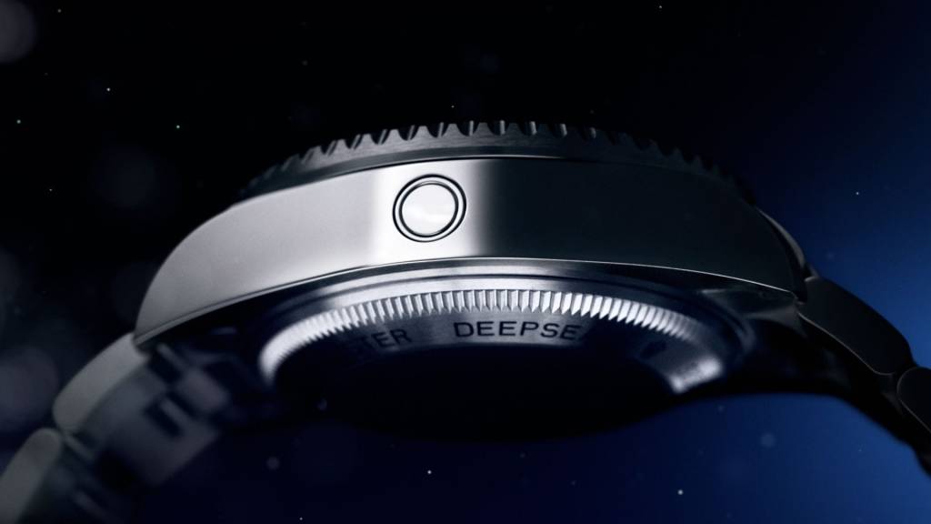 Die Rolex Deepsea D-Blue wurde gemeinsam mit dem Dokumentarfilm “Deepsea Challenge 3D” von James Cameron an der Premiere im American Museum of Natural History in New York vorgestellt. Die grüne Schrift symbolisiert dabei das U-Boot mit dem der Blockbuster Regisseur 2012 in den Marianengraben auf 10’908m abgetaucht ist.